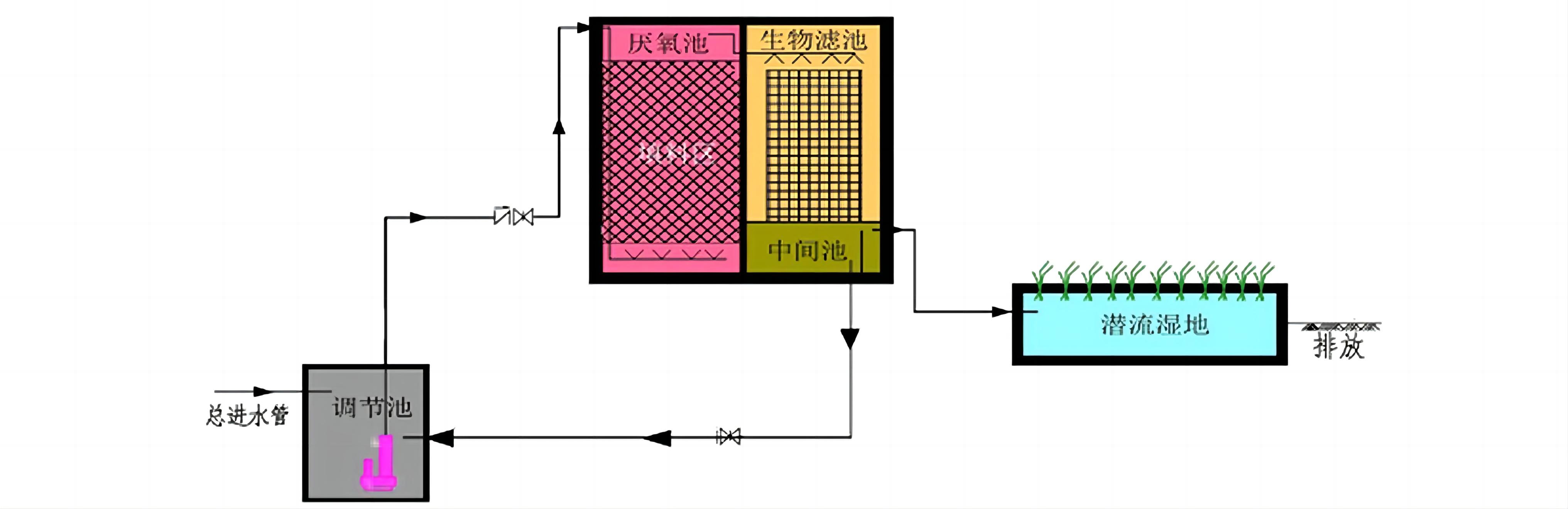 工藝原理∶模塊化分層生物滴濾池屬于生物膜法污水處理工藝范疇,主要由集水池、復(fù)合濾床、中間池、人工濕地等部分組成。通過特殊強化濾料進行生物和生態(tài)處理實現(xiàn)污水達標處理。