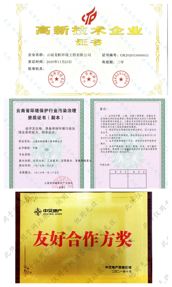 公司持有環(huán)保工程專業(yè)承包二級(jí)、市政公用工程總承包三級(jí)、建筑工程總承包三級(jí)、污染治理乙級(jí)、污染治理設(shè)施運(yùn)行服務(wù)二級(jí)資質(zhì)證書。前后獲得“十二五”生態(tài)文明建設(shè)突出貢獻(xiàn)單位、云南省省級(jí)成長型中小企業(yè)、云南省知識(shí)產(chǎn)權(quán)優(yōu)勢(shì)企業(yè)、云南省科技型中小企業(yè)、云南省專精特新中小企業(yè)、招商蛇口最佳合作伙伴、中交置業(yè)友好合作方獎(jiǎng)等榮譽(yù)。